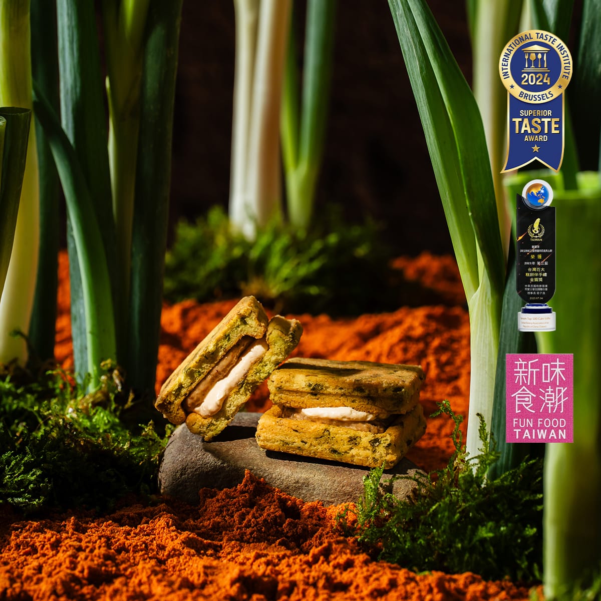 口感細緻、清脆香甜,融入酥脆餅皮,內餡結合鹹香鹽味,佐以特製奶油,每㇐口咬下,外酥內脆、蔥鹽香氣在口中四溢。