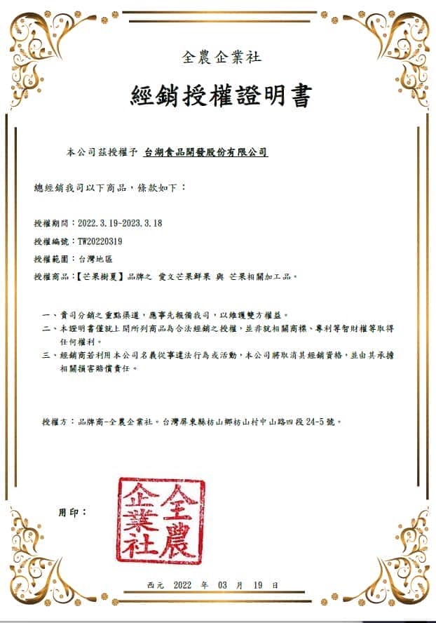 本公司負責的「芒果樹夏」是盧家輔導屏東芒果產銷班第55班班員所栽種果品,由盧家芒果技術指導,並把關品質與出貨包裝,故外箱上標示盧家嚴選標章,請消費者認明選購。經多年合作,台湖很榮幸接下「芒果樹夏」台灣總代理的任務,上市以來廣獲國內粉絲們的喜愛,銷量年創新高,在團購、電商領域,甚至香港等海外市場,已成為愛文芒果的一張名片。