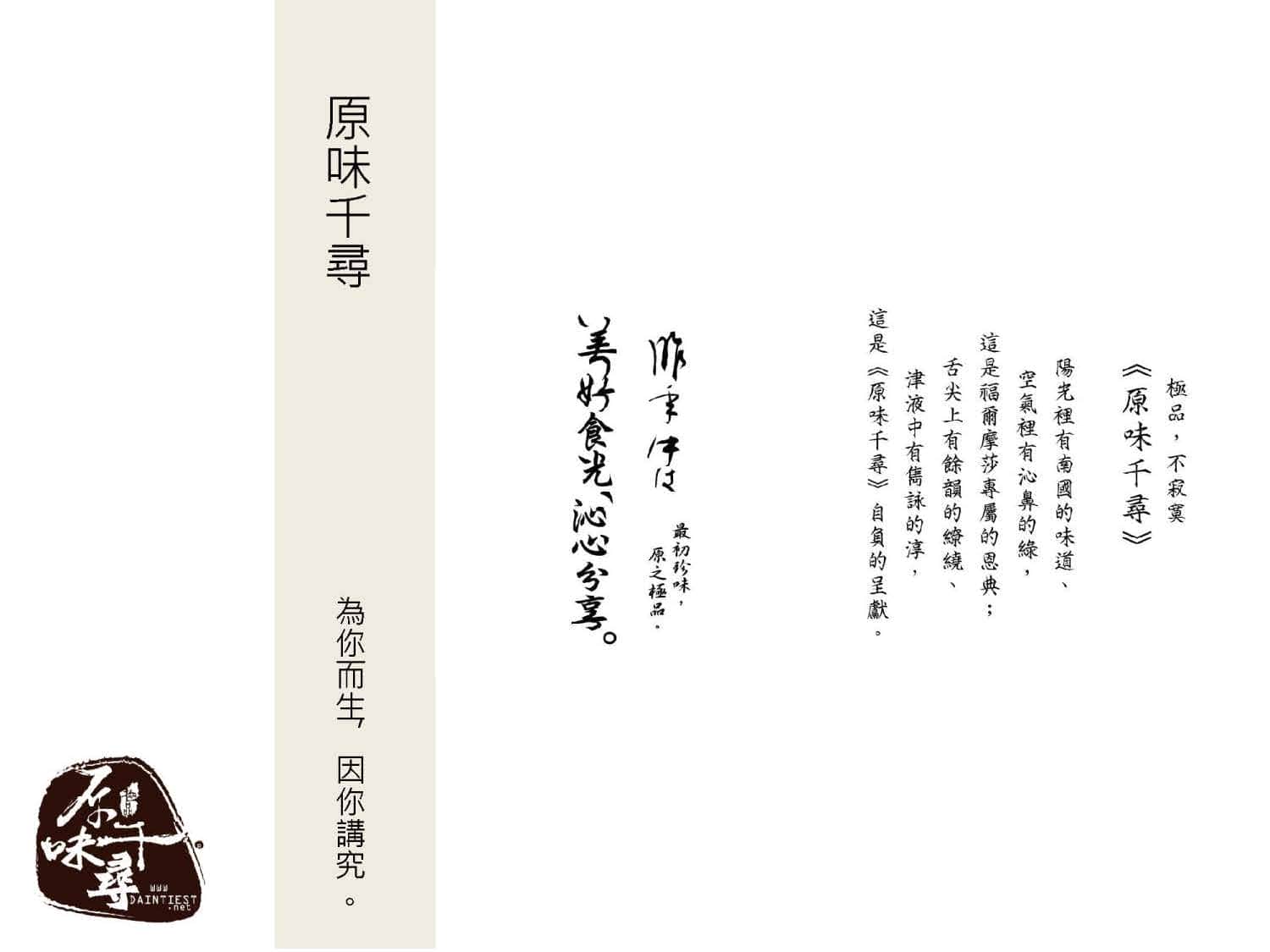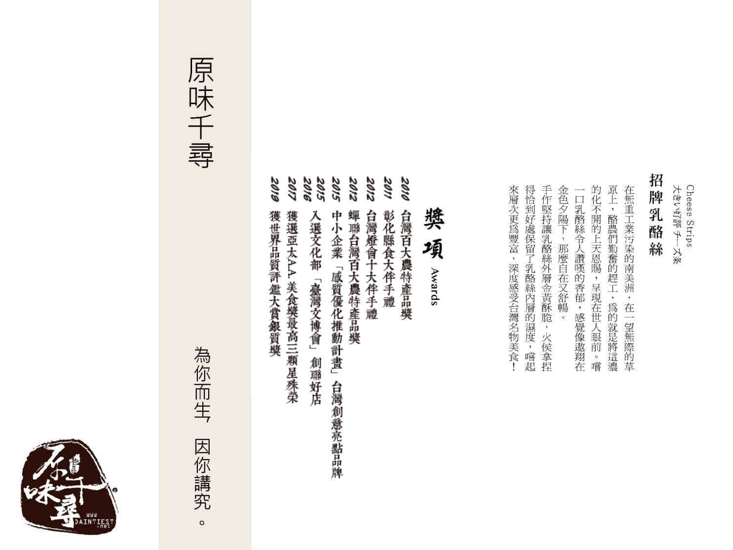 原味千尋創立於2006年,致力打造出休閒食品除了美味也可以兼顧健康的形象。在日語中,尋是一種度量單位,「原味千尋」期許在休閒食品領域扎根扎得深,並傳達對自家產品深厚的信心。