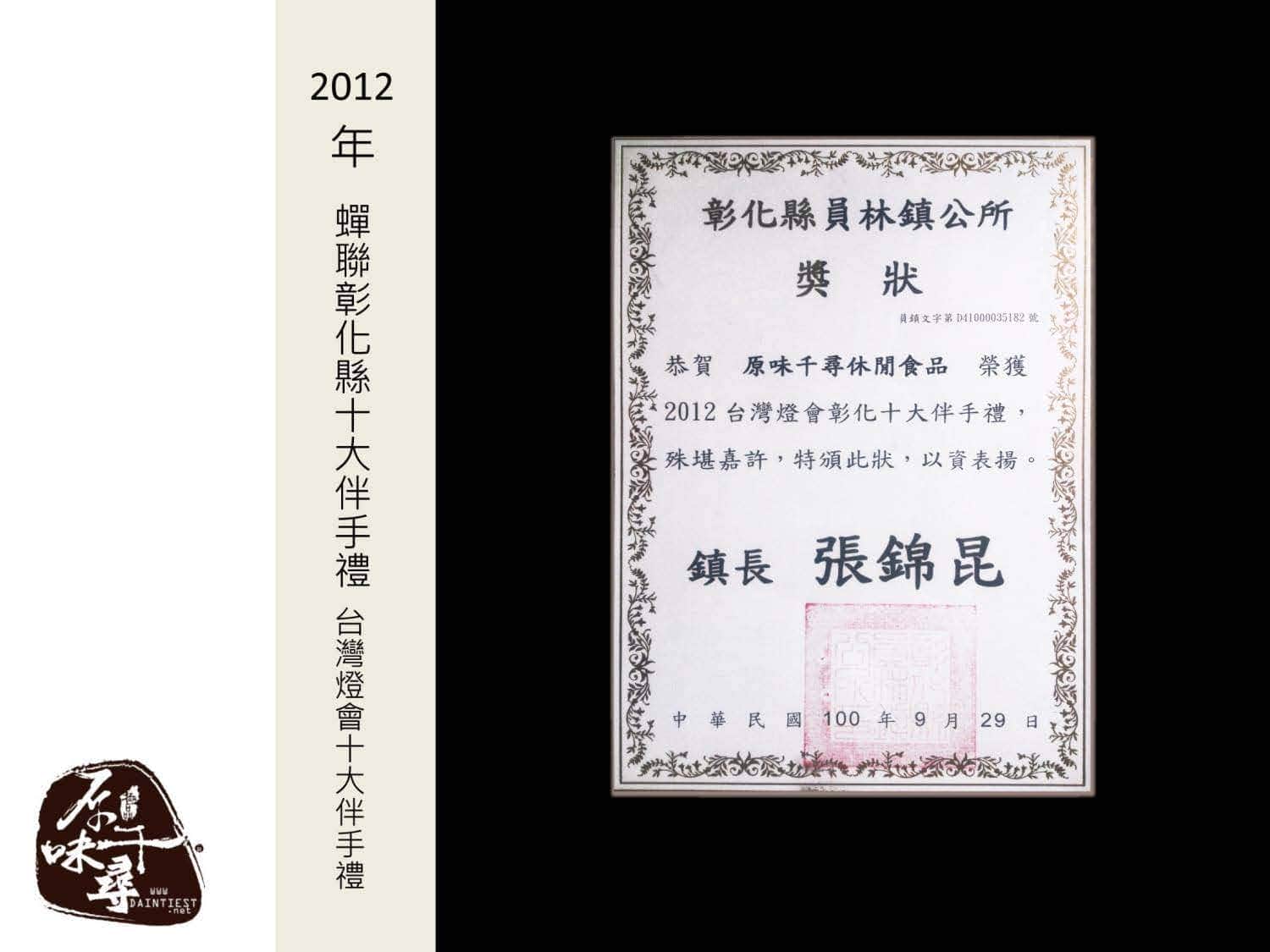 2012年 蟬聯台灣百大農特產品獎 Taiwan excellent Top100