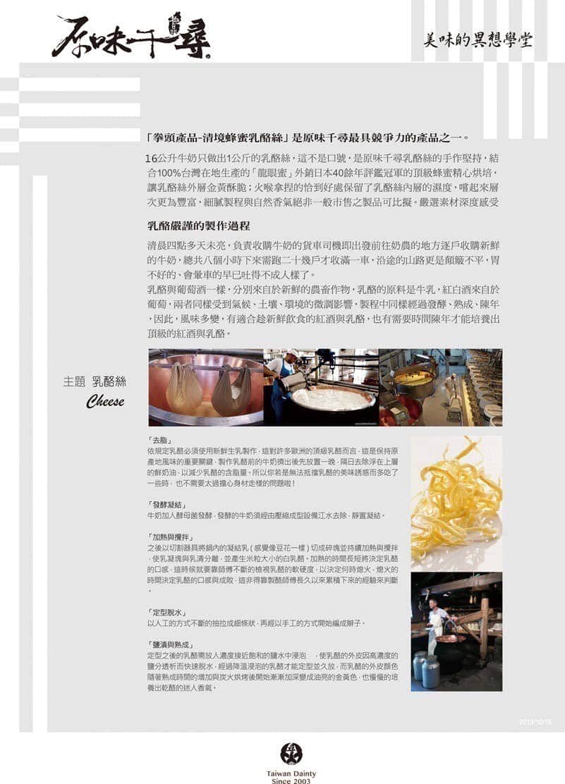 原味千尋乳酪絲製作過程耗時又費工!剝成細絲的乳酪絲烘烤前還要先靜置一個晚上恆溫風乾,接著由經驗老到的師傅以低溫烘烤,精準的火侯拿捏及時間控制才能達到外層酥脆有嚼勁但內層濕潤的豐富多層次口感。嚴謹的酸鹼值、鹽份、水活性的控制,這樣的製作堅持,才製成世界上少數能夠常溫存放至少6-12個月的乳酪產品。