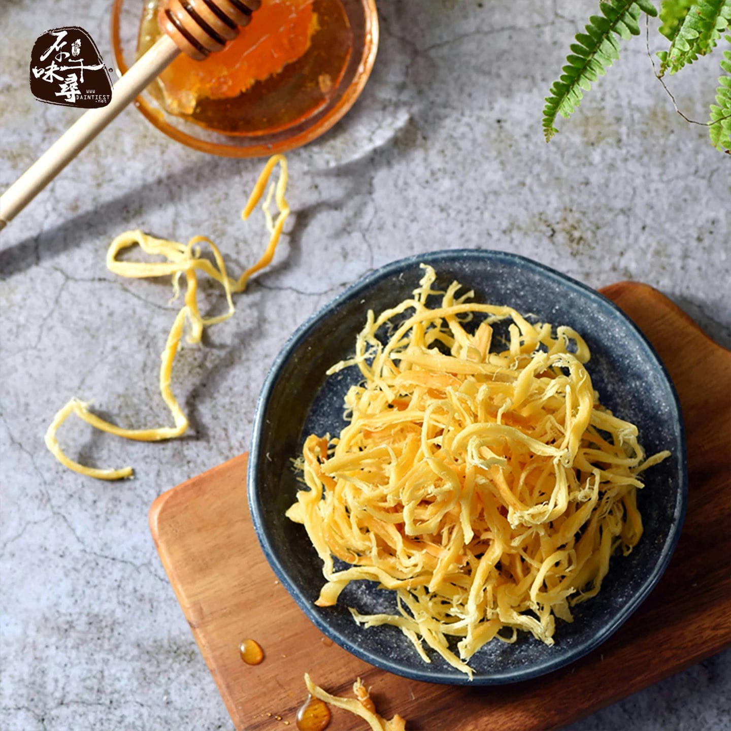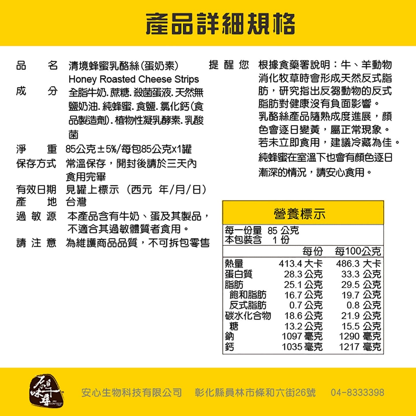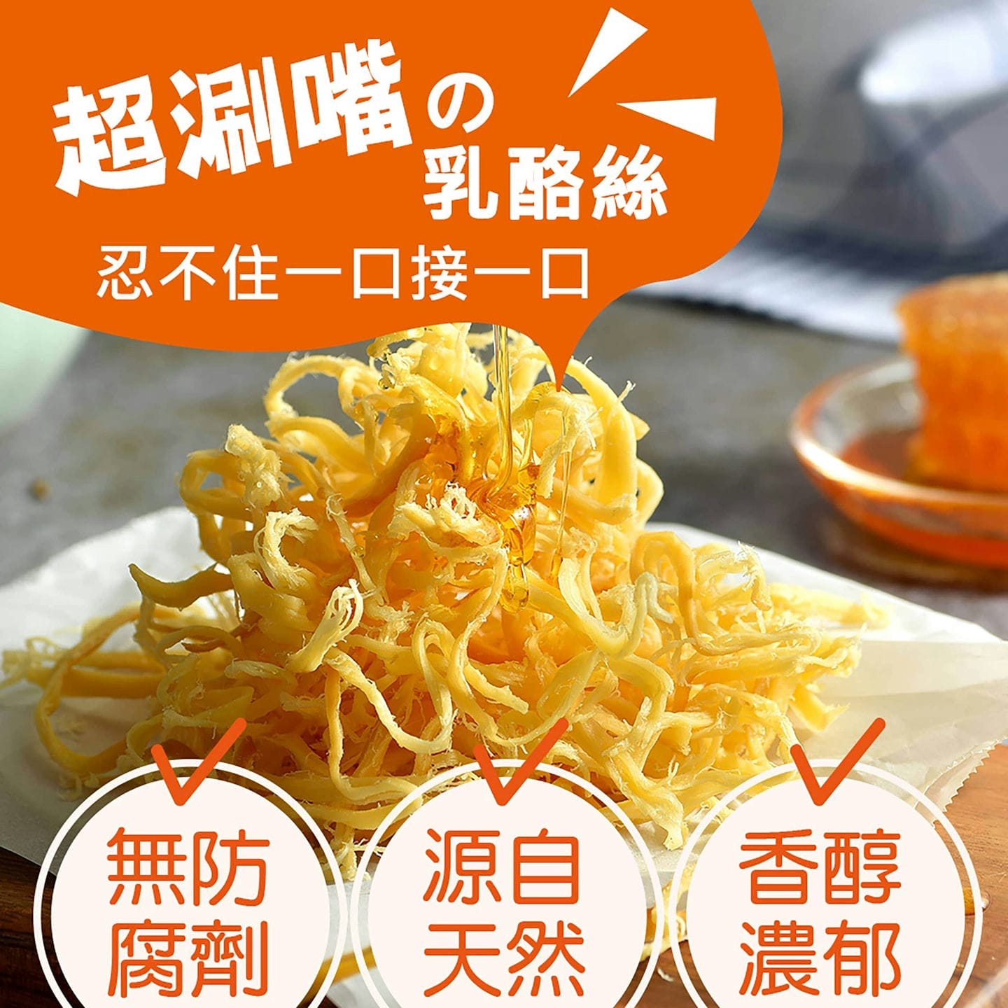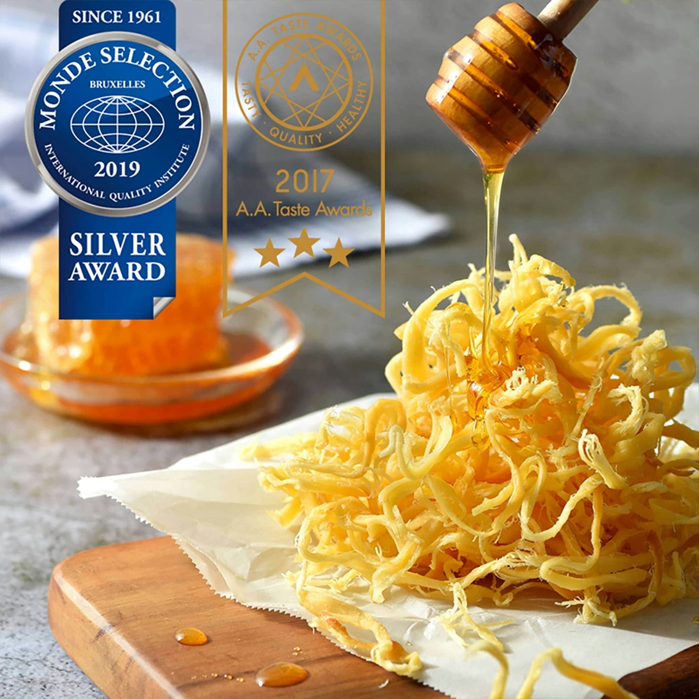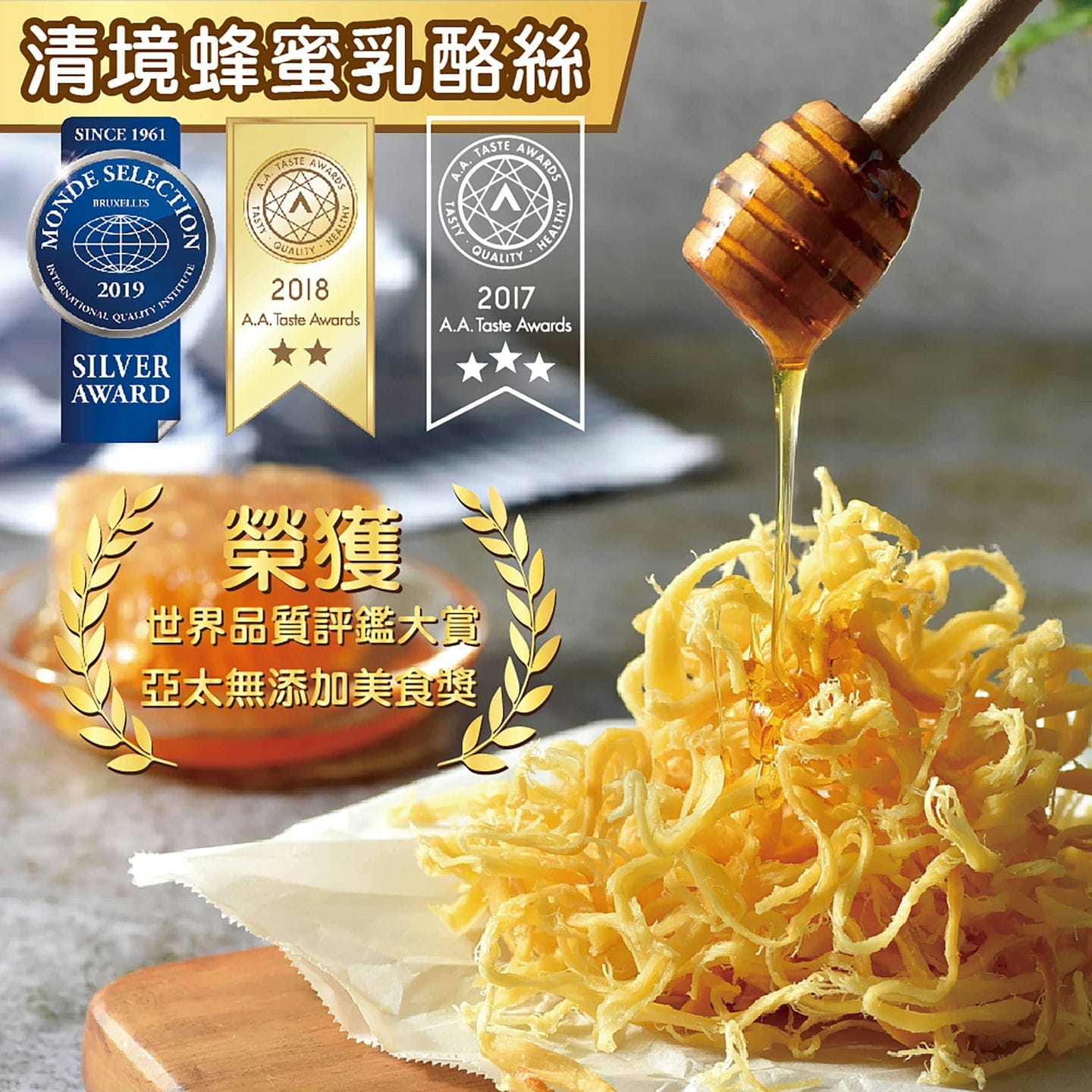 原味千尋乳酪絲加入甜蜜蜜的清境蜂蜜,口感更加順口香甜~蜂蜜的甘醇和乳酪絲的鹹甜結合,意外迸出意想不到的好滋味。蜂蜜皆在水源、空氣皆屬優質的環境才能採釀好蜜,因此而有清境美名。超級涮嘴的乳酪絲,忍不住一口接一口。無防腐劑,源自天然,香醇濃郁。100%牛奶製作,純天然,熊安心。富含高天然鈣,吃得美味又健康。16公斤牛奶僅製成1公斤乳酪絲,手工剝絲。更榮獲世界品質評鑑大賞、亞太無添加美食獎。黃金乳酪絲的美名絕對是實至名歸。