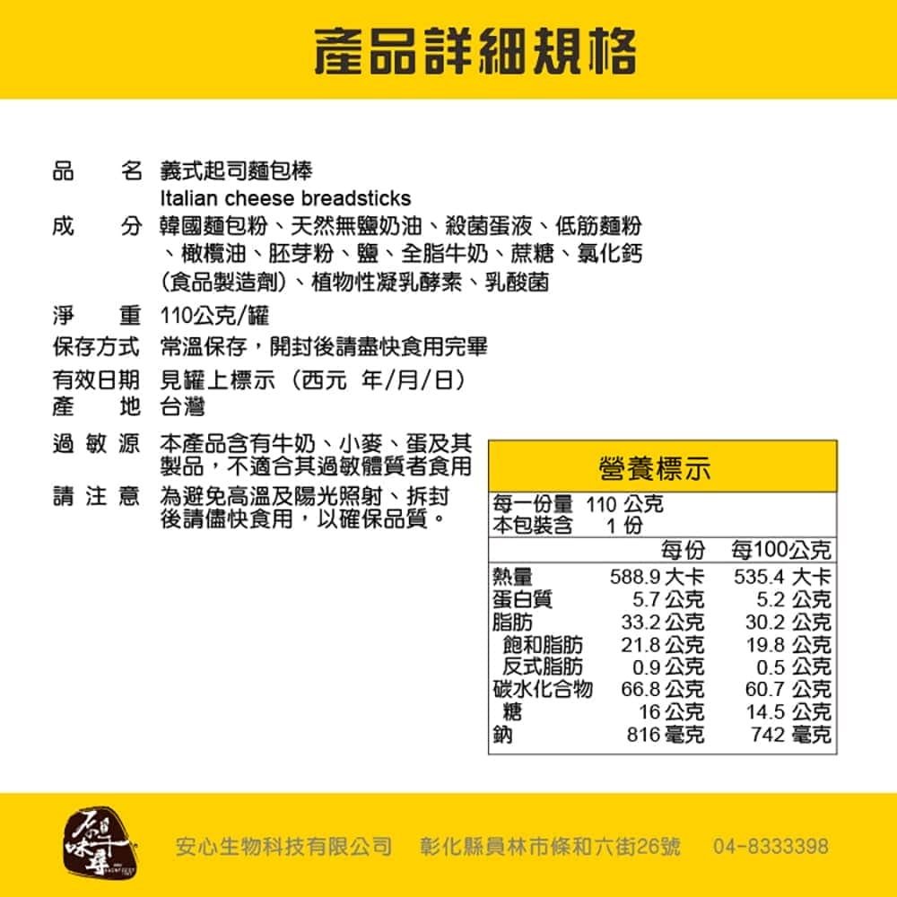台灣休閒食品乳酪絲的第一品牌「原味千尋」,推出全新商品義式起司麵包棒,香濃酥脆濃郁奶香,乳酪酥的新滋味! 嚴選新鮮食材,爽脆推薦,香濃起司,100%鮮乳。鹹脆風味,無香料,無甜味劑,無添加防腐劑。 產品內容 品名:【原味千尋】 義式起司麵包棒 規格:110g±5%*1罐 箱入數:40盒 保質期:90個月 箱材積:60*40*19 (cm) 箱毛重:7.6kg 與我們聯繫: