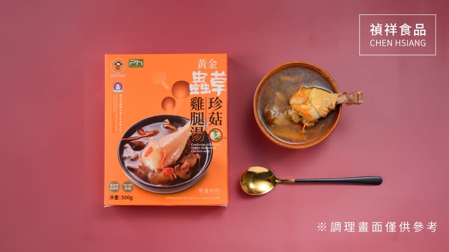 嚴選台灣雞腿及古老名貴藥材黃金蟲草, 添加秀珍菇、洋菇、人蔘等珍貴食材, 熬煮出鮮甜爽口而富餘韻的迷人風味, 黃金蟲草保留完整蟲草多醣體, 非常適合增強體力或術後身體的恢復。 【產品規格】 品名 :黃金蟲草珍菇雞腿湯 箱毛重:12.7 kg 規格 :500g/盒 箱入數:24盒 保值期:2年 箱材積:39*36*23 【聯絡我們】
