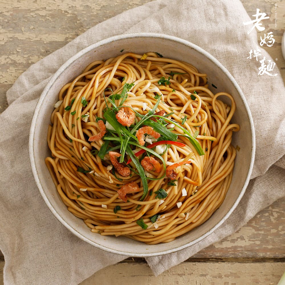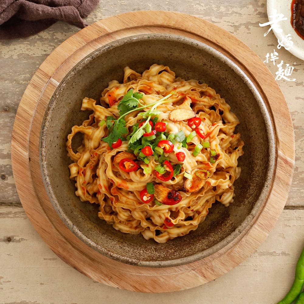 老媽拌麵經典口味,嚴選天然食材製作麻辣醬,搭配手工日曬關廟寬麵條。